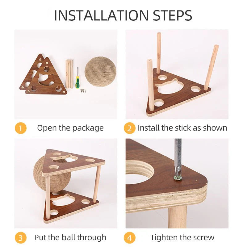 - 🐈 Easy to Install: This cat toy has a screwdriver and is very easy to install. Connect a triangle board with a stick, place the sisal cat scratching ball on the stick at the top, place another board on the stick, and tighten the three screws on the board.